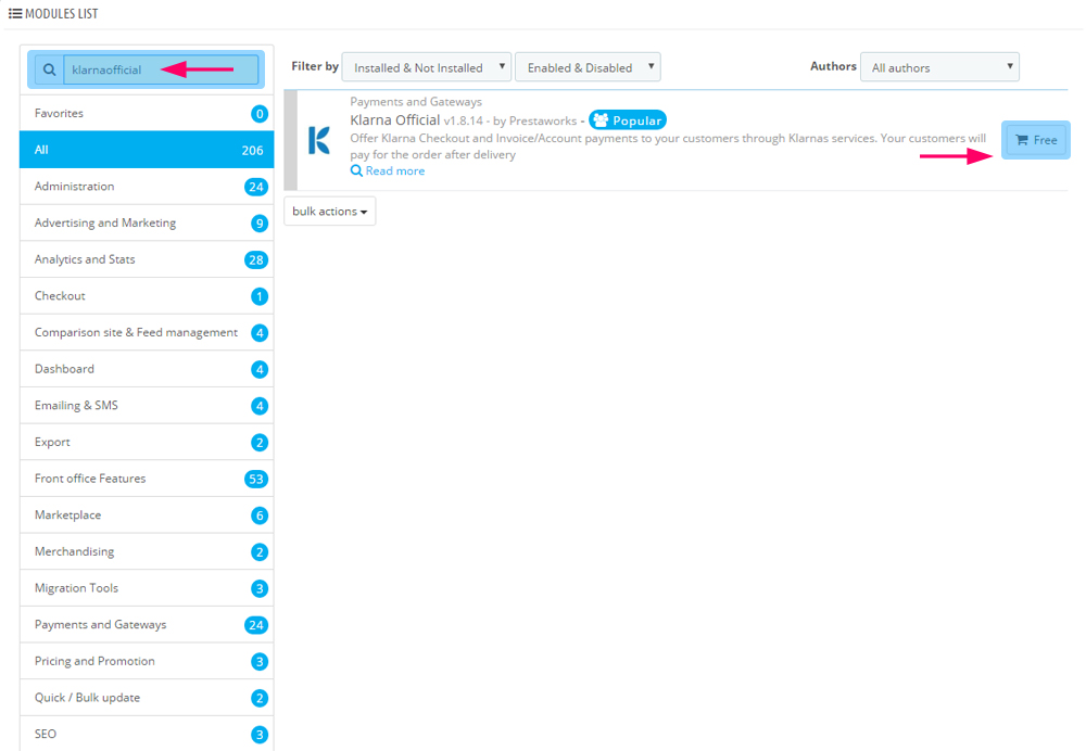 - You will receive one hit for the search - Klarna Official by Prestaworks. At the very right, hit the button called Free