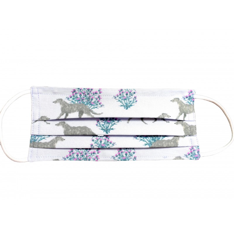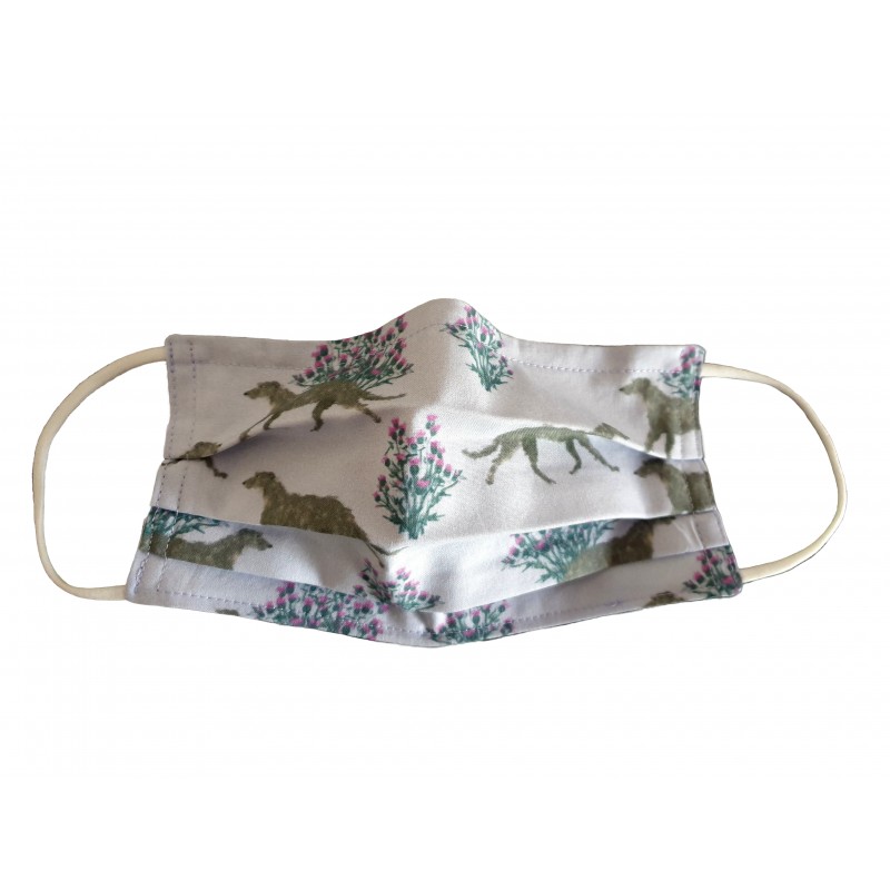 Die Behelfsmaske besteht aus Lagen vorgewaschenem Baumwollstoff. Die äußere Lage ist aus Baumwolle mit Deerhound-Design. Die innere Lage aus weißem Baumwollstoff.