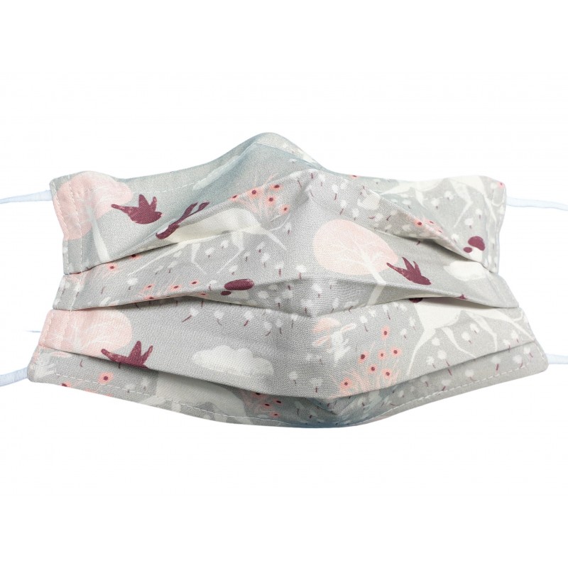 Zweilagige Behelfsmaske aus Baumwolle mit Windspiel Motiv auf hellgrauem Untergrund.