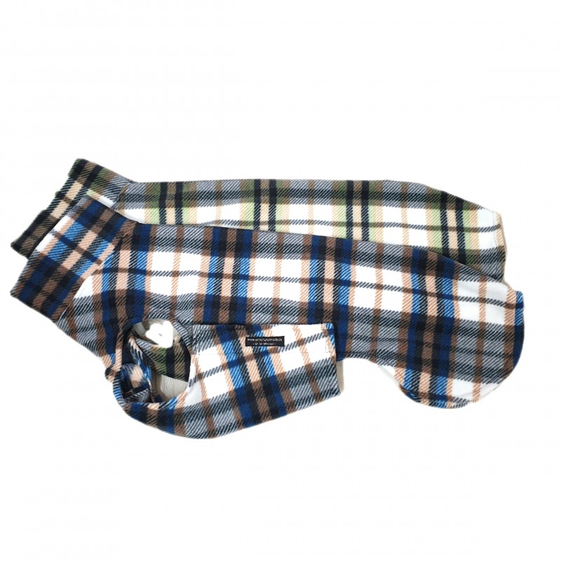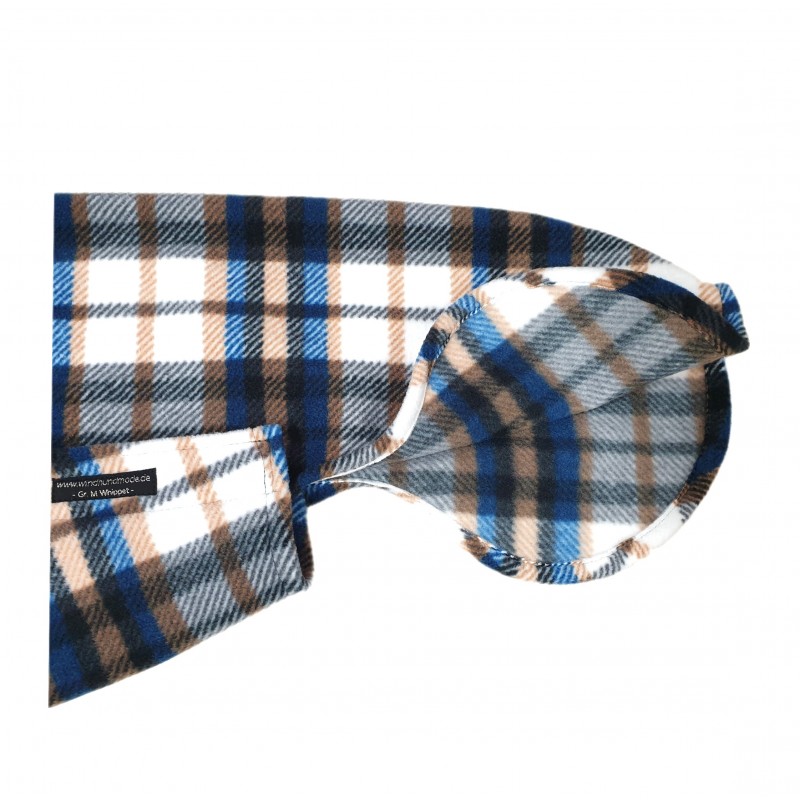 Schöner Whippet Pullover aus dickem, karierten Polar Fleece in den Farben blau, grau, beige.