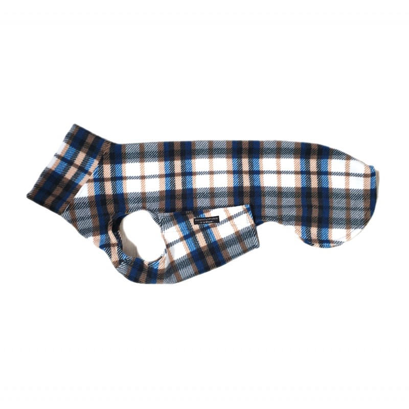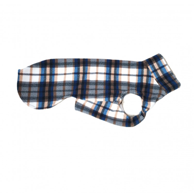Warmer Whippet Pullover aus hochwertigem, kariertem Polar Fleece in den Farben blau-grau-beige.